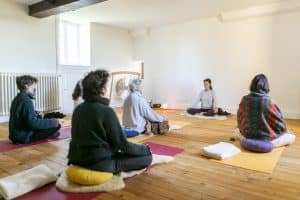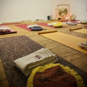 Les tapis de yoga, couvertures et coussins sont fournis.